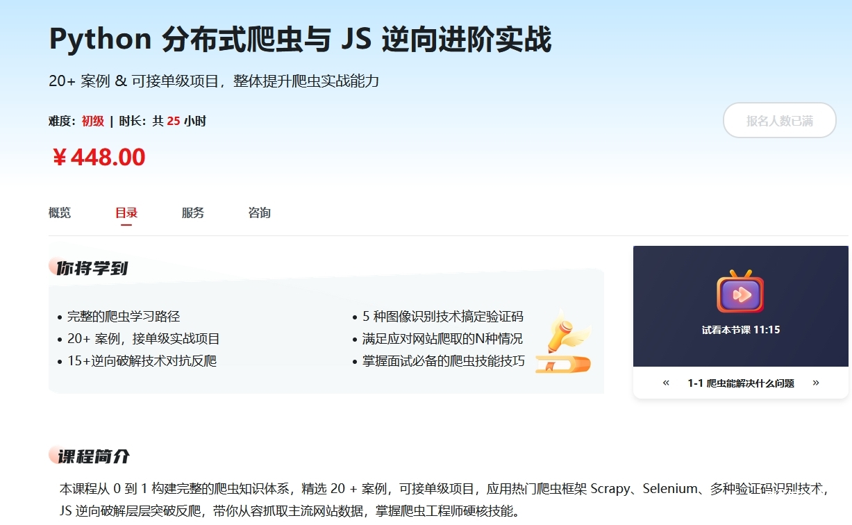 本课程从 0 到 1 构建完整的爬虫知识体系,精选 20 + 案例,可接单级项目,应用热门爬虫框架 Scrapy、Selenium、多种验证码识别技术,JS 逆向破解层层突破反爬,带你从容抓取主流网站数据,掌握爬虫工程师硬核技能。